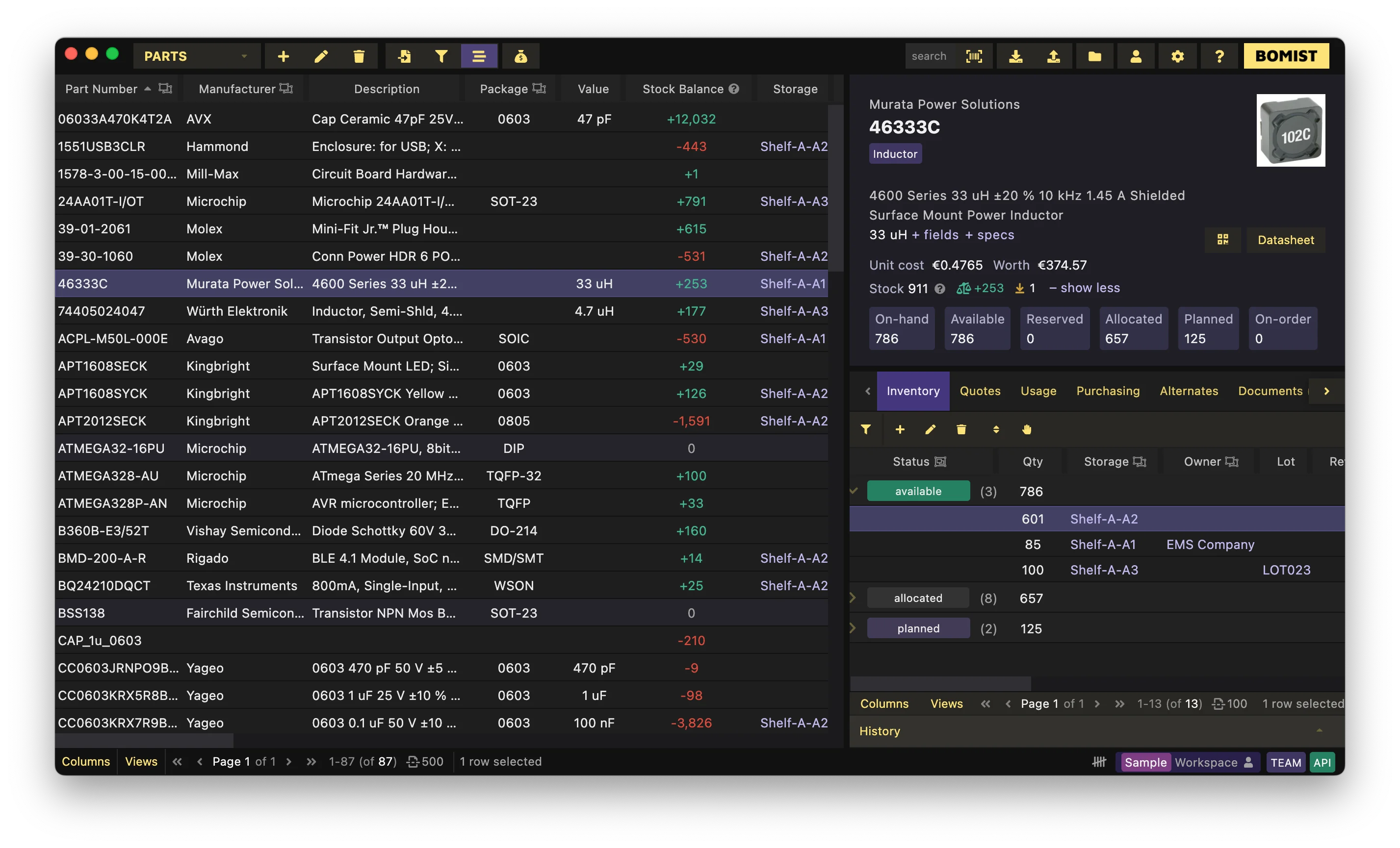 Get to know which parts you have, where they are stored, and when and how they are being used. Quickly access complete part specifications, datasheets and other relevant documents. Keep track of inventory in multiple locations.